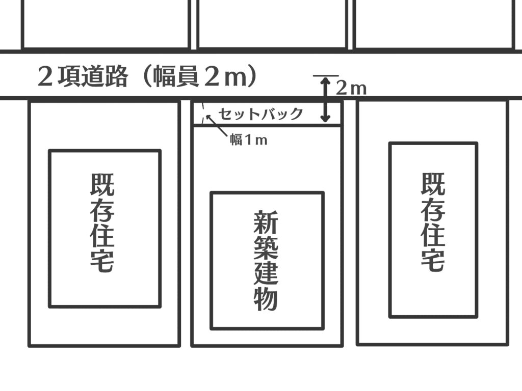 つまり、現行の建築基準法を満たすために、敷地の一部を道路として扱い、建物を敷地の奥に後退させて建てることを「セットバック」と言います。