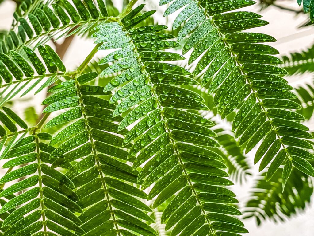 エバーフレッシュはマメ科コヨバ属の常緑樹で、正式名称は「コヨバ・アルボレア(Cojoba arborea)」。中南米や熱帯アジアに自生しており、室内でも育てやすい観葉植物として人気があります。繊細な羽のような葉が特徴で、日中は開き、夜になると閉じる“就眠運動”を行うことで知られており、まるで呼吸をしているような姿がとても愛らしく、「見ているだけで癒される植物」としてファンも多いです。
