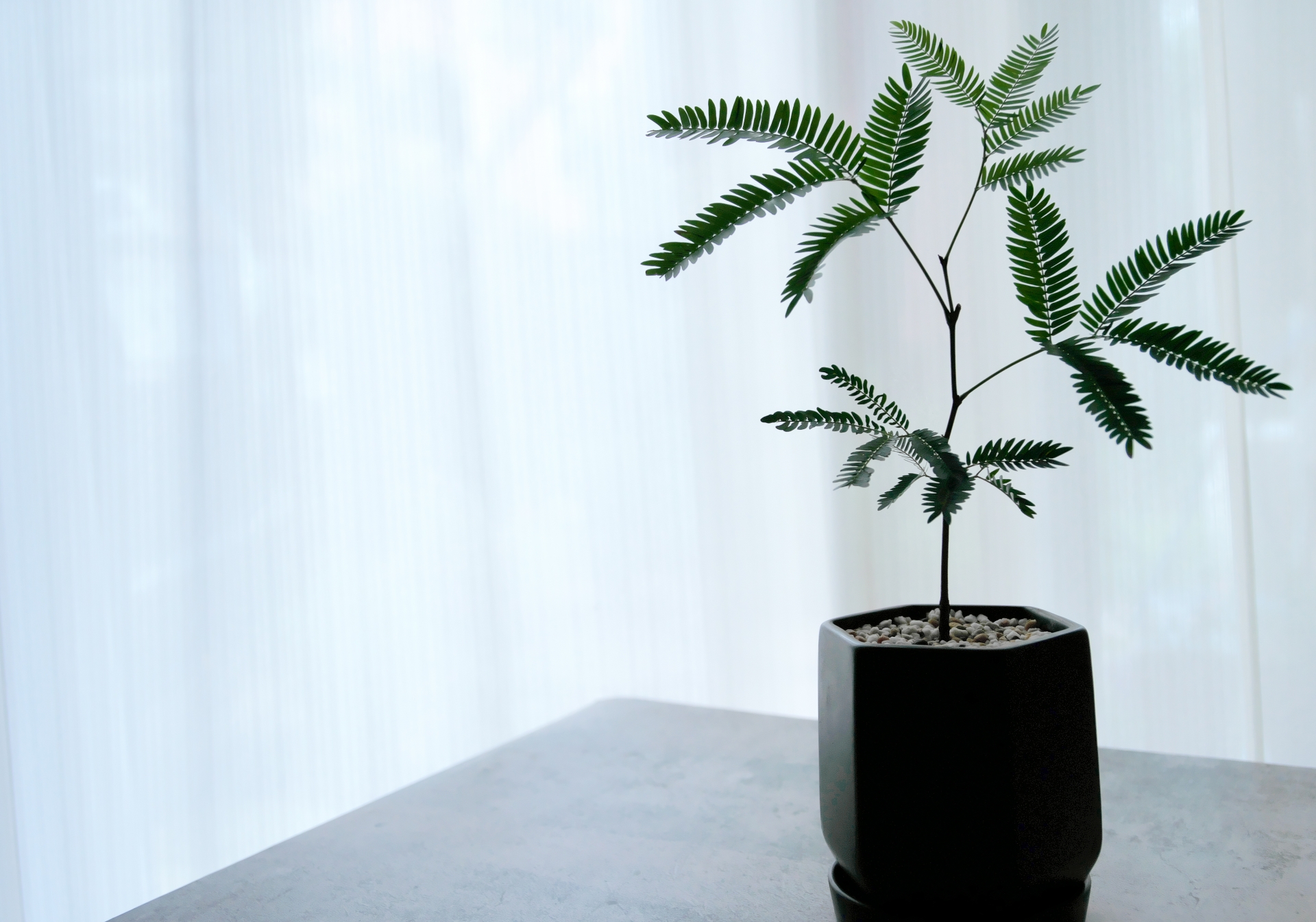 細く繊細な葉が光をやわらかく通し、風にそよぐ姿が美しいエバーフレッシュ。存在感はありながらも主張しすぎず、ナチュラルで落ち着いた印象を与えます。
