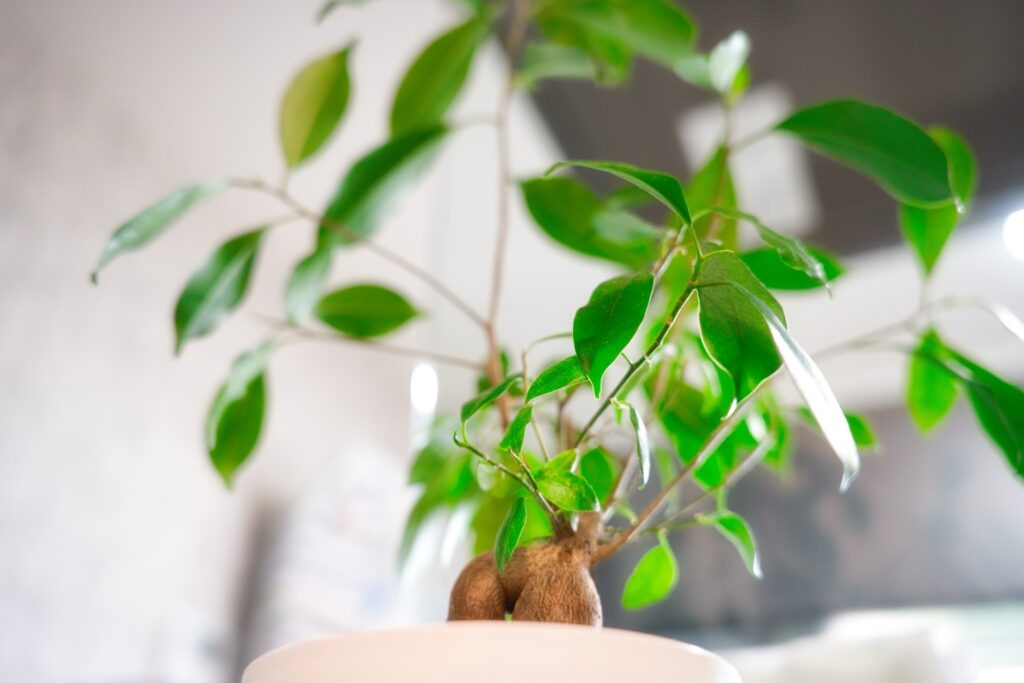ガジュマルはコンパクトな鉢でも十分楽しめます。棚、デスク、キッチンカウンターなど、ちょっとしたスペースにも置けてインテリアになじみやすい植物です。